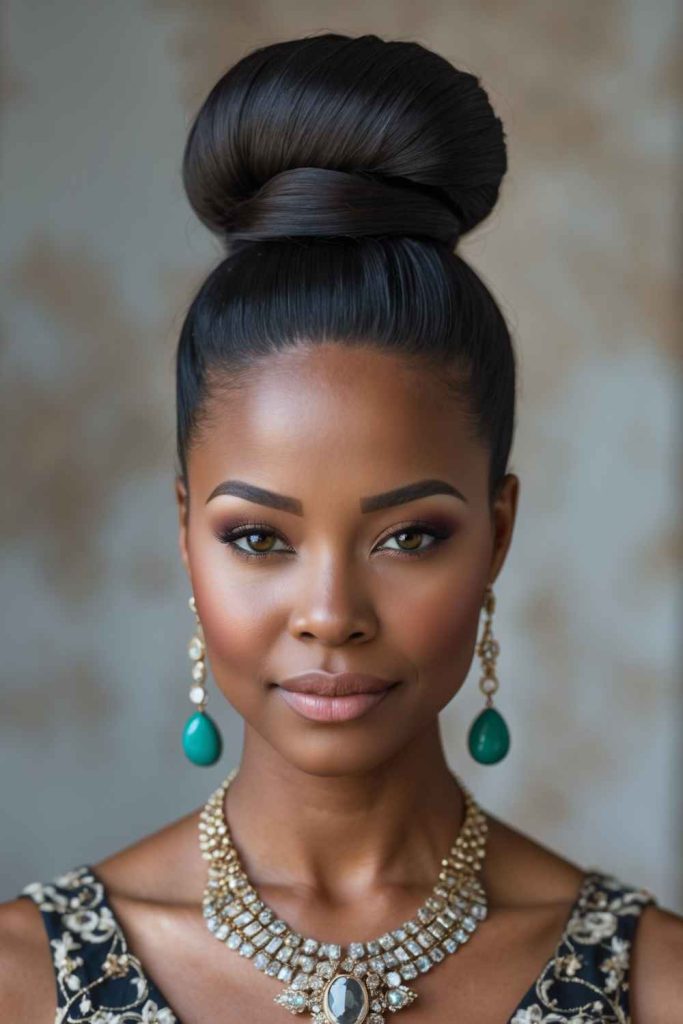 The high bun is an elegant and sophisticated updo that effortlessly combines style and practicality. This classic hairstyle involves gathering the hair neatly and securing it into a smooth, large bun positioned high on the crown of the head.