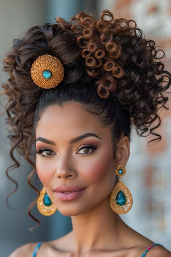 This high, voluminous updo resembles the top of a pineapple, giving it its charming name. Ideal for both casual outings and special occasions, the Pineapple Updo not only highlights natural curls but also keeps the hair off the face and neck.